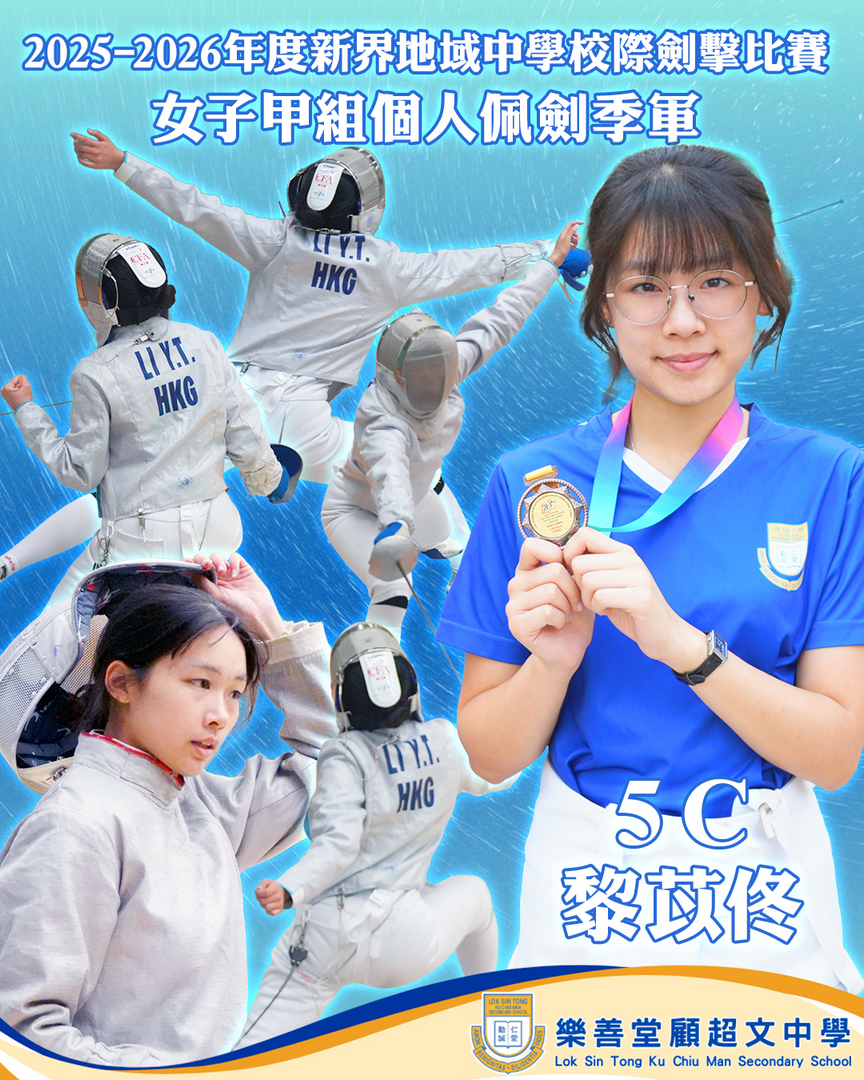 -女子甲組佩劍季軍:5C黎苡佟 比賽日期:29-3-2026(星期日) 比賽地點:香港公園體育館 本校5C黎苡佟同學於新界地域中學校際劍擊個人比賽傳來好消息。 她發揮出色,奪得女子甲組佩劍個人賽季軍實在可喜可賀,恭喜恭喜!